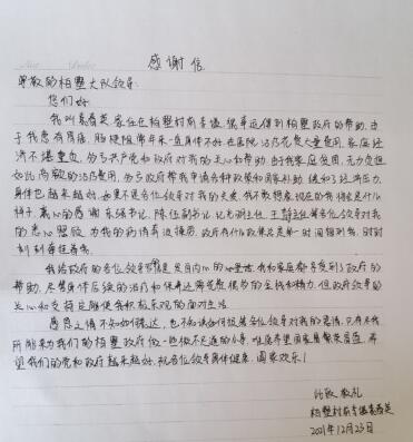 袁春英患有胃癌和腸梗阻,常年來一直身體不好,在醫(yī)院治療花費了大量的費用,家里的經(jīng)濟負擔(dān)很重,無力負擔(dān)高額的治療費用。了解到她的情況后,柏墅村積極幫助她申請各種政策和國家補助,希望可以緩解她的經(jīng)濟負擔(dān)。“多虧政府幫我申請了很多補貼,緩解了經(jīng)濟壓力,現(xiàn)在的身體也越來越好,如果不是各位領(lǐng)導(dǎo)對我的關(guān)愛,我不敢想象現(xiàn)在的我將會是什么樣子。”袁春英在自己的手寫感謝信中寫道。