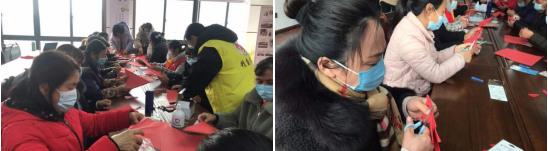 歡樂的游戲環(huán)節(jié)結束后,志愿者和居民們圍坐在桌邊,領取剪紙材料和工具。大家埋頭剪紙,用靈巧的雙手將原本平平無奇的紙張上剪出精美的圖案。隨后,居民們還將剪出的窗花粘貼在底板上,變成了一個個喜慶的掛飾。
