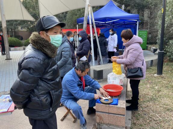 “磨刀、磨剪子嘞……”這樣能夠喚起不少居民少時(shí)回憶的吆喝聲在活動(dòng)現(xiàn)場(chǎng)響起,來(lái)自社區(qū)果彩志愿服務(wù)隊(duì)的張師傅正在給社區(qū)居民磨菜刀。刀身與磨刀石之間發(fā)出的霍霍聲,很自然讓人聯(lián)想到“磨刀霍霍向豬羊”的場(chǎng)景,也從內(nèi)心深處涌起對(duì)新春佳節(jié)即將來(lái)臨的喜悅感。