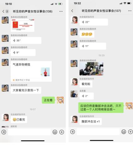 “海姆立克急救法又稱海姆立克腹部沖擊法,最常見的就是在呼吸道堵塞異物時使用。左手握拳,右手從前方握住左手手腕,使左拳虎口貼在患者胸部下方,肚臍上方的上腹部中央,形成‘合圍’之勢,然后用左拳虎口向患者上腹部內上方猛烈施壓。大家可以看一下視頻講解,練習一下。”張霞老師講解完基礎知識后又結合視頻案例與居民們進行互動,整個群內氣氛活躍、熱烈。