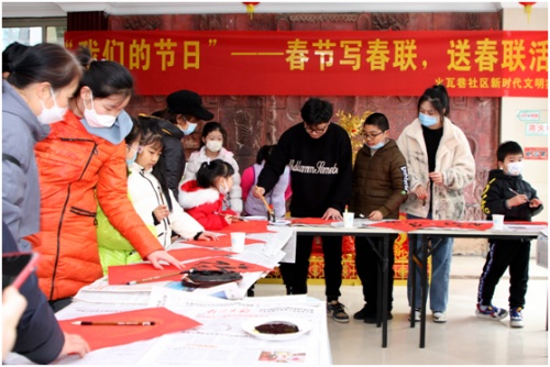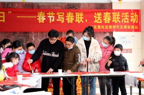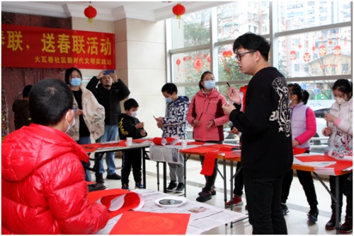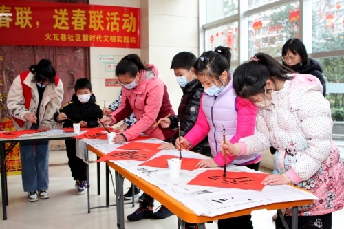 火瓦巷社區(qū)組織美術(shù)書法培訓(xùn)中心志愿者老師給小朋友們輔導(dǎo)書法寫春聯(lián),在活動現(xiàn)場增添迎新春祝福冬奧新元素,營造迎新春祝福冬奧氣氛,跨進(jìn)社區(qū)開拓創(chuàng)新局面。