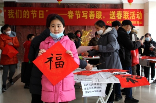 娃娃展紙研墨寫春聯(lián)“福”進(jìn)社區(qū)迎春來