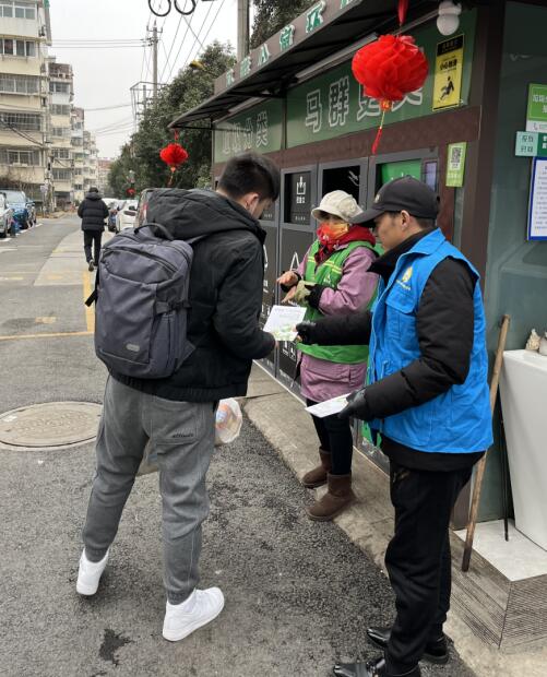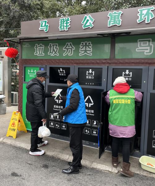 2月中旬,南京市棲霞區(qū)馬群街道果場(chǎng)社區(qū)“齊益果”城市治理志愿者在社區(qū)馬群公寓小區(qū)的垃圾分類(lèi)房前,就小區(qū)垃圾分類(lèi)積分制向居民進(jìn)行宣傳和倡導(dǎo)。