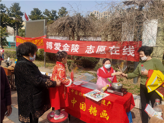 活動現(xiàn)場最熱鬧的當(dāng)屬民俗區(qū),站點負(fù)責(zé)人邀請了非遺傳承人也同樣是南京市養(yǎng)老服務(wù)時間銀行志愿者隊伍的一員,只見她一邊控制著火候熬糖,一邊用工具甩糖、吹糖、作畫,一個個精巧的人物、動物和神話中的形象就出現(xiàn)在了他的手里。孩子們目不轉(zhuǎn)睛地看著這位民間藝術(shù)家,制作的時候,孩子們屏氣凝神,成品出現(xiàn)時,孩子們歡呼雀躍。領(lǐng)到糖人的孩子開心地欣賞著,舍不得吃,沒領(lǐng)到的孩子則眼巴巴地等著,“點單”自己想要的糖人形象??諝庵袕浡鸾z絲的糖味兒,也充斥著孩子們的歡聲笑語。