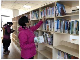 圖書室內(nèi)有多種類型的自選圖書,“全民閱讀 楓閱四季”聽讀海報(bào)上也有多個(gè)二維碼可供讀者們掃碼聽讀,安靜舒適的閱讀環(huán)境讓前來讀書的婦女同胞們非常喜歡。“《環(huán)游四?!芬杂斡浀姆绞接涗浐蛡鬟_(dá)了許多中國著名的人文地理美景、美食、地方人物故事等內(nèi)容,讓我們?cè)谝咔槠陂g也能暢游天下。”秦阿姨笑著說道。一旁的王女士看到書架上的烹飪書籍,愛不釋手,挑選了自己喜愛的兩本書借閱帶回家準(zhǔn)備小試牛刀一下。此外,志愿者們給大家分發(fā)了“書香棲霞”筆記本,號(hào)召大家多讀書,讀好書,全民閱讀,書香社區(qū)。讀者們悄聲交流自己的閱讀心得,書屋內(nèi)閱讀氛圍濃厚。