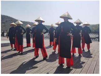 婦女們還相約一起學(xué)跳民族舞,大家頭戴尖頂草帽,身著藏青色上衣、大紅色長(zhǎng)褲,跟著領(lǐng)舞的動(dòng)作認(rèn)真學(xué)習(xí)。領(lǐng)舞挨個(gè)糾正居民們不規(guī)范的動(dòng)作,并強(qiáng)調(diào),跳民族舞時(shí),身體儀態(tài)特別重要,不能塌腰駝背,肩膀要打開,要給觀眾展現(xiàn)出自己自信的一面。