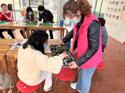 最后園藝?yán)蠋熛虼蠹医榻B了多肉植物的形態(tài)特征、主要品種、生長特點以及多肉的日常養(yǎng)護(hù)方法,并現(xiàn)場示范了正確栽種多肉綠植的方法。女同胞們認(rèn)真聆聽,仔細(xì)觀察,在動手種植環(huán)節(jié),大家變身妙手花匠,小心翼翼地找準(zhǔn)位、扎穩(wěn)根、埋好土、植多肉,在動手的過程中展示出豐富的創(chuàng)造力,打造出各具特色的“綠色盆景”。