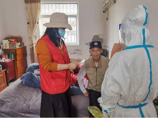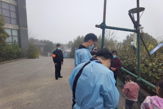 村書記張小祥,第一書記袁錚杰一早便來到核酸檢測現(xiàn)場開展工作,奔忙在核酸檢測現(xiàn)場第一線,囑咐村民群眾嚴(yán)格遵循核酸檢測規(guī)定,前后保持一米安全距離。其他志愿者們則拿著喇叭在村內(nèi)喊話,呼吁村民主動進(jìn)行核酸檢測,為確保不漏一戶、不漏一人,醫(yī)護(hù)人員和志愿者還為村里老弱病殘等出行不方便的村民提供上門采集核酸服務(wù),他們來到行動不便的村民家中,向他們傳達(dá)政府防疫工作,并提供核酸采樣服務(wù)。