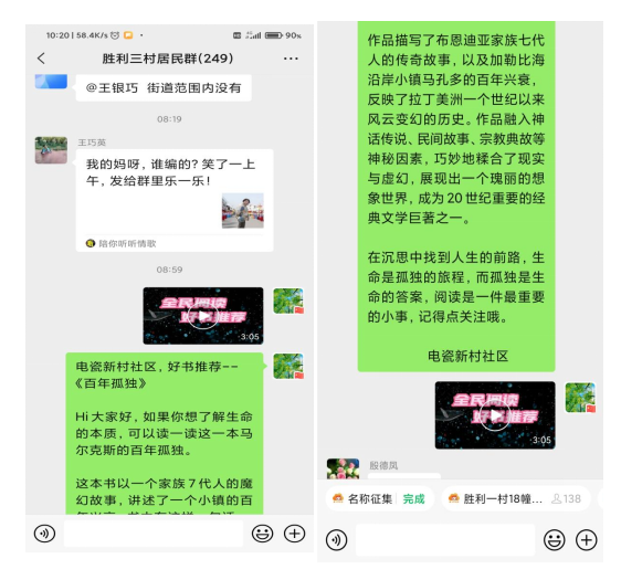 在社區(qū)微信群內(nèi),社區(qū)綜合文化服務(wù)中心工作人員為居民群眾推薦世界文學史上經(jīng)典佳作——《百年孤獨》。小說描寫了布恩迪亞家族七代人的傳奇故事,以及加勒比海沿岸小鎮(zhèn)馬孔多的百年興衰,反映了拉丁美洲一個世紀以來風云變幻的歷史。作品融入神話傳說、民間故事、宗教典故等神秘因素,巧妙地糅合了現(xiàn)實與虛幻,展現(xiàn)出一個瑰麗的想象世界,成為20世紀重要的經(jīng)典文學巨著之一。工作人員鼓勵大家在居家監(jiān)測期間可以打開紙質(zhì)書感受文字的魅力,也可以使用微信讀書、豆瓣閱讀軟件閱讀電子版圖書,在沉思中找到人生的前路。