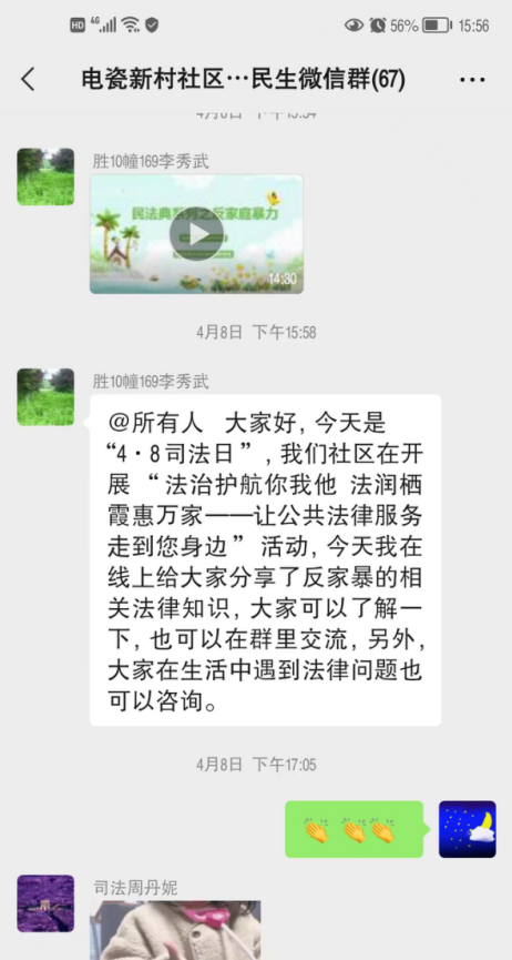 為了進一步推動社區(qū)平安法治建設(shè),從源頭上預防和制止家庭暴力,增強轄區(qū)內(nèi)廣大婦女同胞的反家暴意識,4.8司法日,南京市棲霞區(qū)燕子磯街道電瓷社區(qū)法律顧問在微信群開展線上普法教育,將反家暴知識“送上家門口”。