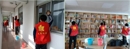 分發(fā)好抹布、水桶、掃帚和拖把,志愿者們正式開(kāi)始了勞動(dòng),擦桌子、抹玻璃、拖地,將社區(qū)辦公樓的會(huì)議室、辦公室、科普室等各個(gè)房間一一清掃干凈,并將圖書(shū)室的書(shū)本重新分類(lèi)擺放整齊。