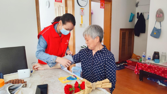 5月7日一早,社區(qū)茶壽居家養(yǎng)老服務(wù)中心志愿者朱玲、周繼就帶著包裝好的花束和往期活動(dòng)照片來到了成員家中,為成員們送上鮮花與母親節(jié)的祝福,同時(shí)還為成員們測量血壓。