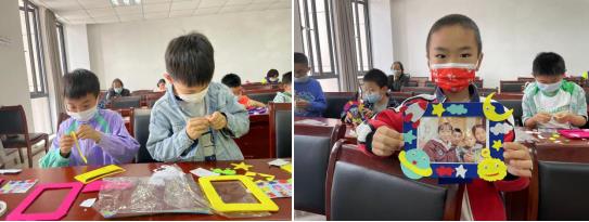 活動最后,志愿者老師帶著孩子手工制作相框,孩子們和家長一起動手,不一會兒漂亮的相框就制作完成,家長與孩子們一同并把帶來的全家福裝進(jìn)相框,孩子們高興地拿著自己的作品相互分享欣賞。