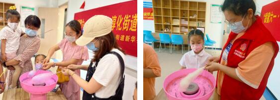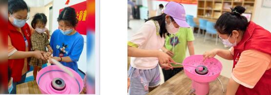 線下棉花糖制作也受到小朋友們熱烈的喜愛。放人彩糖、轉(zhuǎn)動(dòng)紙棒,親手制作的棉花糖是最甜蜜、最美味的。小朋友們耐心的排隊(duì)等候,在家長和社工的協(xié)助下,享受節(jié)日前甜蜜的時(shí)光。