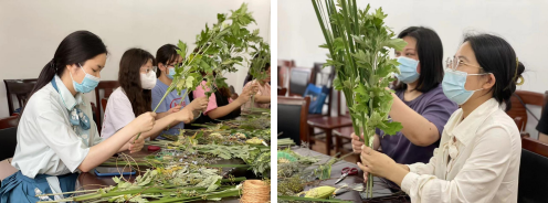 活動(dòng)的現(xiàn)場(chǎng)散發(fā)著陣陣艾草的清香,給在場(chǎng)的居民們都帶來(lái)了美好的心情。大家一起學(xué)習(xí)了解了有關(guān)端午節(jié)的一些知識(shí),對(duì)于今天要制作的艾草花束也有初步的認(rèn)知。緊接著,大家邊看示范,動(dòng)手包起手中的艾草花束。先折彩紙,分艾草,接著把多余的葉子剪掉,再用紅繩捆綁,最后包花束,在各個(gè)居民的巧手下艾草被精心裝扮,一堆堆艾草變成了一束束既好看又能驅(qū)蟲(chóng)辟邪的花束。在制作過(guò)程中,大家遇到了問(wèn)題也會(huì)互相討論,不知不覺(jué)中,每個(gè)人之間的距離慢慢拉近了。活動(dòng)在一片歡聲笑語(yǔ)中到了尾聲,大家互相展示了自己的成品,分享了各自在制作中的感悟。