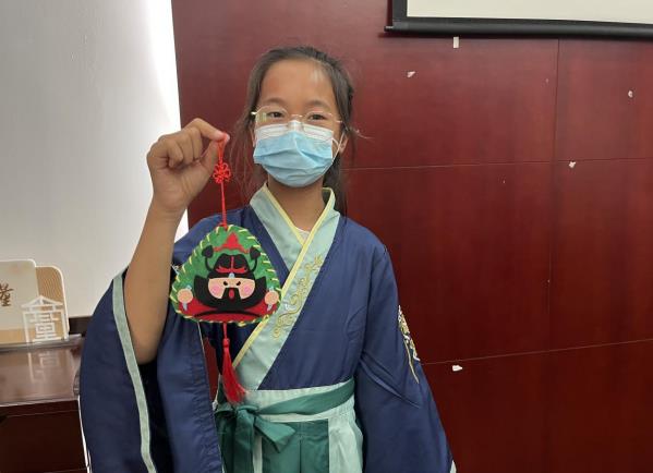 端午佳節(jié),換上傳統(tǒng)漢服,學(xué)習(xí)傳統(tǒng)文化,小朋友們興高采烈參與民俗文化的答題,積極答題者的額頭上是用雄黃寫的王字。隨后,在社工的帶領(lǐng)下,大家紛紛開始了香囊制作,縫制過程有條不紊,不一會兒,一個個粽子造型、散發(fā)著艾草清香的手工香囊便呈現(xiàn)在大家面前。