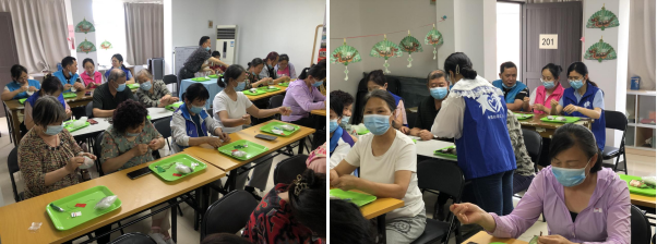 隨后,志愿者帶領(lǐng)大家制作香囊。手做香包是我國傳統(tǒng)民俗,佩戴用艾草、香草等中草藥填充的香囊有助于安神、防蚊蟲叮咬,志愿者發(fā)放香囊材料,居民認(rèn)真的穿針引線,制作香囊,三角形、圓形、寶袋型……居民們發(fā)揮自己手工制作的技巧,在歡聲笑語中將一個個香囊制作出來,居民們紛紛表示,回去要將香包送給最愛的人。