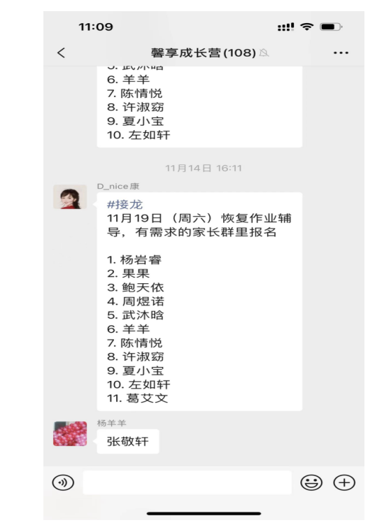 “本周六(11月12日)上午9:00,大學生志愿者將走進社區(qū)二樓活動室開展義務課業(yè)輔導活動,有需要的請接龍報名。”近日,南京市棲霞區(qū)馬群街道馨康苑社區(qū)“馨享成長營”項目通過居民社區(qū)群進行了學員招募。
