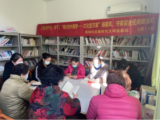 2023年1月11日,南京市棲霞區(qū)馬群街道果場社區(qū)依托社區(qū)新時代文明實踐站在社區(qū)圖書閱覽室,組織社區(qū)黨員、居民、“齊益果”積分制志愿者開展了“我們的中國夢 ——文化進萬家”主題揚家風、守家訓全民閱讀活動。