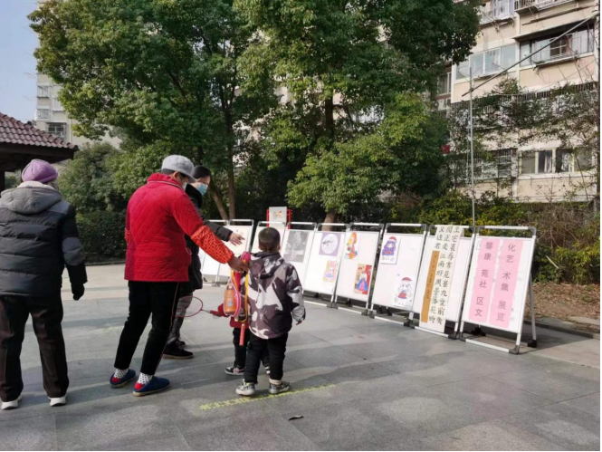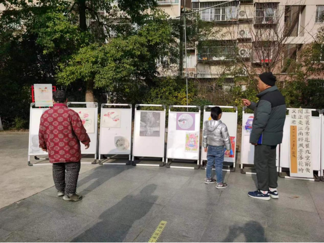 在展覽開(kāi)始前,社區(qū)工作人員將文化藝術(shù)作品沿著馨康苑小區(qū)文化廣場(chǎng)進(jìn)行了布置,特地選取了小區(qū)內(nèi)人員聚集之地,以此來(lái)擴(kuò)大影響力。在布置結(jié)束后,小區(qū)居民在進(jìn)出廣場(chǎng)的時(shí)候就能看到展覽,來(lái)來(lái)往往的居民紛紛駐足觀看。有個(gè)大姐牽著自己的孩子駐足在展覽的作品前,大姐一一為孩子介紹文化藝術(shù)作品的內(nèi)容:“這一副是老虎、這一副是書法、這一副是動(dòng)漫人物等等。”小朋友認(rèn)真地聽(tīng)著媽媽的講解。
