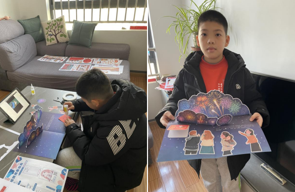 “竹爆驚春,競(jìng)喧闐、夜起千門(mén)簫鼓。”冬令營(yíng)最后一天,小朋友們與家長(zhǎng)共同制作新春立體書(shū),書(shū)中展現(xiàn)了祈福吉星高照、買(mǎi)年貨、恭賀新春、舞龍舞獅等等熱鬧非凡的場(chǎng)景。通過(guò)親子之間的溝通協(xié)作,小朋友們?cè)诹Ⅲw感中再現(xiàn)了獨(dú)具特色的過(guò)年場(chǎng)景,在翻、拉、放、貼中沉浸式感受“年味”。