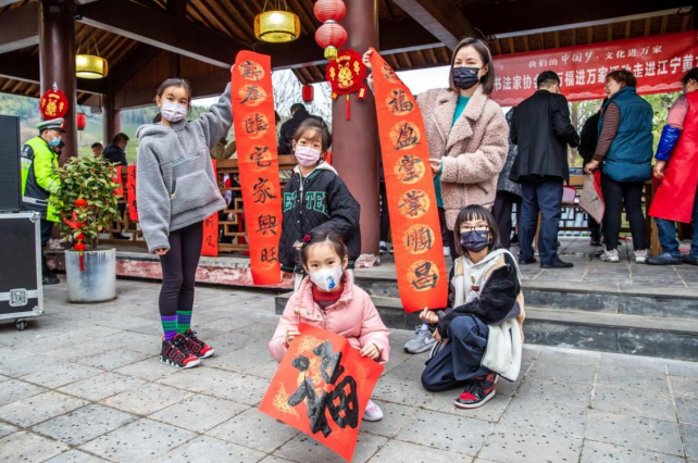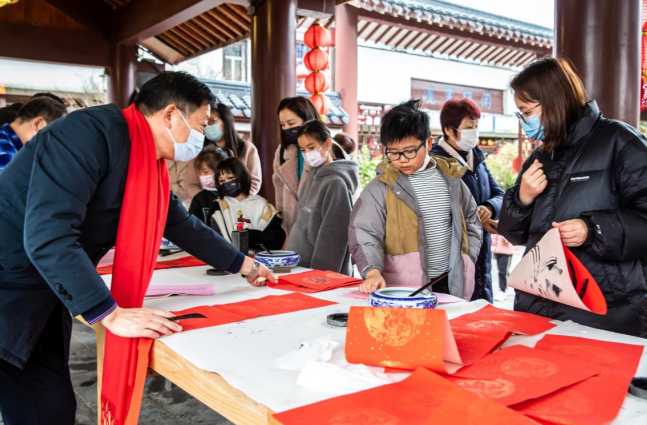 盡管當(dāng)天冬雨綿綿,但是村民和游客們參與活動的熱情不減,迎新取福的村民游客絡(luò)繹不絕。市民阮女士和一家人驅(qū)車從上海來這里游玩,看到書法家們現(xiàn)場寫福字春聯(lián)表示十分驚喜,“黃龍峴我們是第一次來,這里不僅風(fēng)景美麗,年味也很濃,孩子們也玩的很開心。”