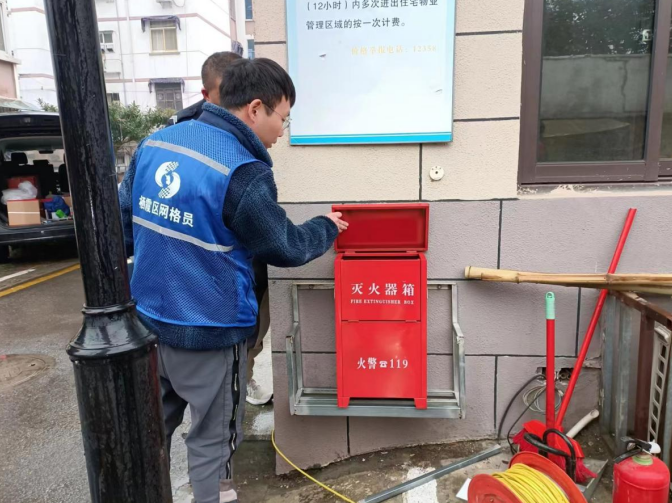 檢查過程中,社區(qū)安全員對小區(qū)內(nèi)滅火器是否過期、放置是否合理、罐體是否變形或損傷、噴口是否堵塞等情況進行逐一排查,并對不合格滅火器進行更換和補充,確保了消防器材的完好、有效,最大限度消除火災隱患??紤]到部分消防設施不完善,社區(qū)安全員還特地安裝了專門的滅火器箱,改善滅火器的存放條件,延長滅火器的使用時效。