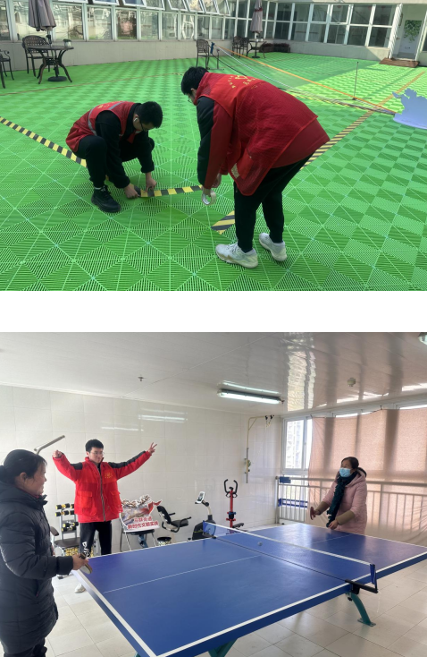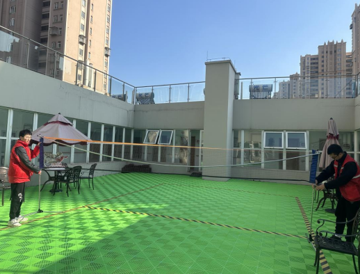 近日,南京市棲霞區(qū)馬群街道蛇盤社區(qū)新時代文明實踐站志愿者給居家養(yǎng)老活動中心天臺鋪上地墊,貼上場地線,并在在場地中間放上一個簡易球網,這樣一個手工搭建的羽毛球場地就完成了。另一邊,兩位居民正在剛換新的乒乓球臺上進行著一場激烈的比賽。