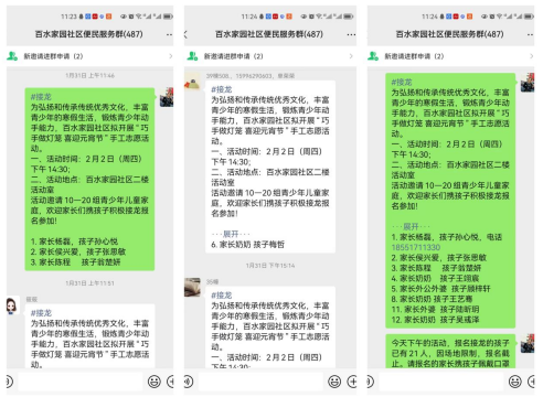 線上宣傳能使社區(qū)服務(wù)方便、快捷,也讓信息的覆蓋面更加廣泛。1月31日,社區(qū)通過“掌上云”平臺(tái)將元宵節(jié)制作花燈活動(dòng)的通知發(fā)布到居民群、網(wǎng)格群內(nèi),邀請(qǐng)居民在群內(nèi)積極接龍報(bào)名參加活動(dòng),截至2月2日,共有21組家庭報(bào)名。