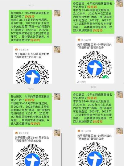在啟動?jì)D女兩癌篩查工作前期,棲霞社區(qū)在7個(gè)掌上云社區(qū)群發(fā)布信息,建立二維碼線上掃碼登記,并及時(shí)在掌上云社區(qū)微信群給予答復(fù),幫助預(yù)約,利用掌上云平臺高效地動員符合條件的居民參與兩癌篩查。