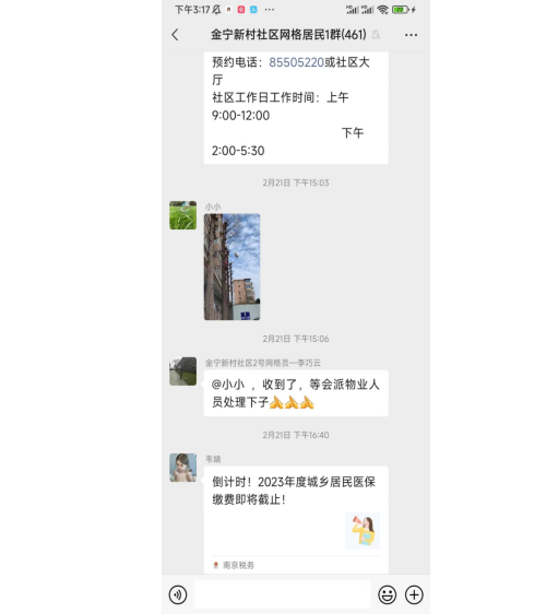 近日,金寧新村社區(qū)居民張女士在微信群發(fā)了一張照片,一個沉甸甸的垃圾袋掛在高達5米的樹枝上,一旦掉落下來可能會砸到路過的居民,造成不必要的人身及財產(chǎn)損失。群主收到消息后,第一時間在群內(nèi)回應(yīng),提醒路過居民注意安全,并及時聯(lián)系物業(yè)人員,當即就帶上工具,將垃圾袋取下。張女士表示非常感謝云平臺,僅僅一張照片,社區(qū)就迅速派人巡查、處理解決了這憂心事兒。