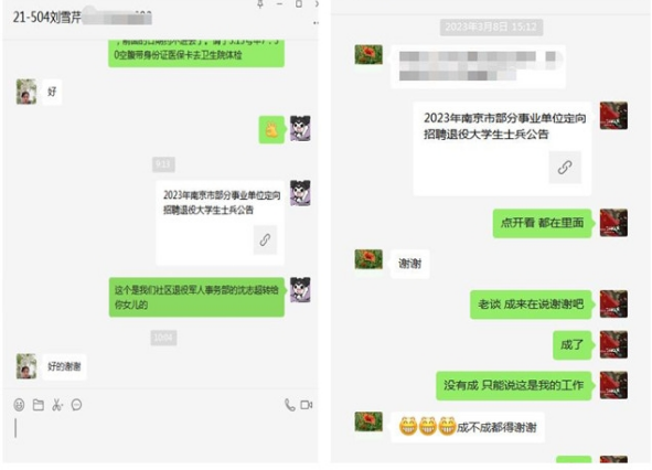 三月初,棲霞區(qū)退役局在公眾號上發(fā)布了2023年南京市部分事業(yè)單位定向招聘退役大學生士兵公告,百水家園社區(qū)退役軍人工作站積極響應,對轄區(qū)內的符合條件的退役軍人又進行一次梳理,積極的和退役軍人本人聯(lián)系,將這個消息傳遞給他們,對于沒有及聯(lián)系到的退役軍人,百水家園退役軍人工作站也聯(lián)系他們家所在網(wǎng)格的網(wǎng)格員,用微信及時通知他們的家人,將招聘信息和鏈接同時發(fā)送過去,為他們能夠找到自己滿意的工作默默的工作著,這些退役軍人的家屬們,也為百水家園社區(qū)退役軍人工作站紛紛點贊,同時也希望他們家的退役軍人能夠應聘上自己滿意的工作。