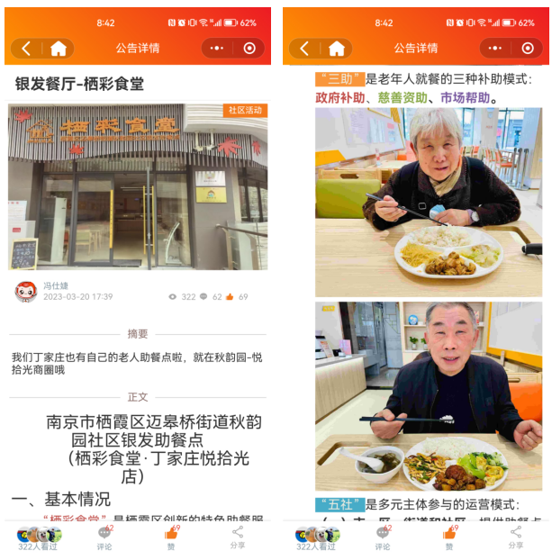 社區(qū)前期在掌上云社區(qū)發(fā)布公告,對銀發(fā)助餐點“棲彩食堂”進行了大力宣傳。“棲彩食堂”是棲霞區(qū)創(chuàng)新的特色助餐服務(wù)品牌,是“棲彩頤養(yǎng)”養(yǎng)老服務(wù)品牌重要組成部分,也是南京市示范性助餐點之一。助餐點面積300平方米,由棲霞區(qū)好來屋公益服務(wù)中心負責(zé)運營,站點功能齊全、環(huán)境溫馨,并配備適老化設(shè)施設(shè)備。目前,助餐點直接供應(yīng)中餐和晚餐,除堂食外,為9個居家站點提供送餐服務(wù),基本滿足了區(qū)域內(nèi)老年人助餐需求,同時輻射周邊社區(qū)居民和上班族。