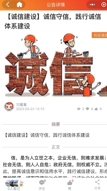 為深入開展誠信文化宣傳教育,進一步弘揚重信踐諾的傳統(tǒng)美德,3月24日,南京市棲霞區(qū)邁皋橋街道山水園社區(qū)開展線上誠信宣傳活動,依托掌上云社區(qū)平臺,定期發(fā)布誠信宣傳鏈接,引導居民樹立誠實守信、遵德守禮的意識,讓誠信宣傳走進千家萬戶。