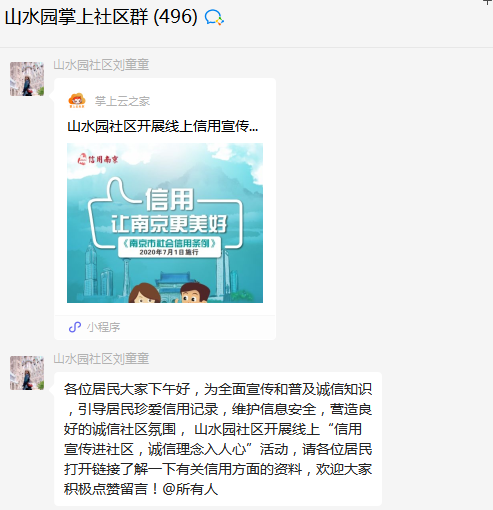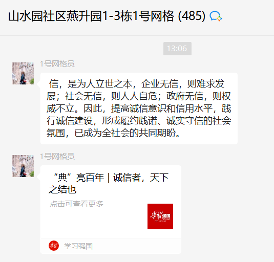 社區(qū)充分利用掌上云社區(qū)微信群覆蓋面廣、傳播速度快的優(yōu)勢,定期在掌上云之家發(fā)布宣傳鏈接,針對居民關注度較高的個人征信、信息保護等問題進行集中宣傳。網(wǎng)格員定期在群內(nèi)發(fā)布有關誠信學習鏈接,向群內(nèi)居民介紹、講解中華民族傳統(tǒng)美德與社會主義核心價值觀中“誠信”的內(nèi)涵,宣傳誠信在個人道德修養(yǎng)與文明城市中的重要意義,教育引導廣大居民誠實守信、崇德向善。