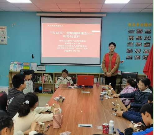 本期課堂內(nèi)容為:神奇的杠桿。課堂上,社區(qū)未成年人在南京師范大學物科院“向心力”志協(xié)大學生志愿者們的幫助下,與大學生講師志愿者一同學習了杠桿的原理。志愿者通過PPT教學展示,向大家講解了杠桿在生活科技中的廣泛運用。社區(qū)未成年人踴躍發(fā)言,進行生活聯(lián)想,有的說杠桿用于稱重,有的說在建筑工地上吊機所蘊含的杠桿原理,有的講述了阿基米德關(guān)于杠桿的故事……隨后,社區(qū)未成年人們在志愿者的教學下,開展了關(guān)于杠桿應用的物理小實驗,手工組裝含有杠桿原理的實驗器材,成功用最少的受力,翹起了重物。