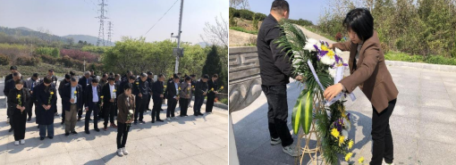 默哀畢,全體人員獻上手中的菊花,緩步繞行、瞻仰紀念碑一周,向革命烈士致敬。最后,大家一起敬讀烈士墓墻壁上的光輝事跡。