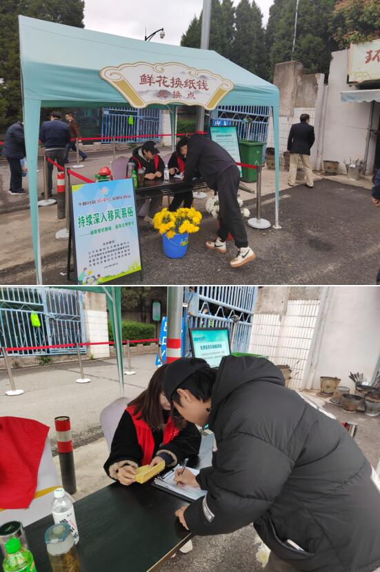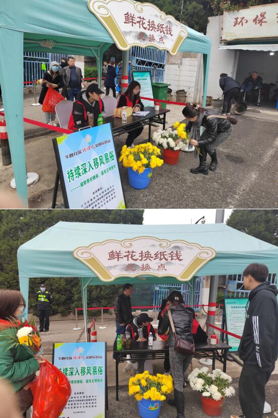活動(dòng)現(xiàn)場,社區(qū)工作人員在隱龍山墓園入口擺放展臺(tái)、張貼文明祭掃宣傳橫幅,設(shè)立“鮮花換紙錢”免費(fèi)兌換點(diǎn),積極宣傳綠色環(huán)保祭祀理念,提倡網(wǎng)上祭奠、親戚代掃、鮮花祭掃等文明祭祀活動(dòng),引導(dǎo)攜帶紙錢祭祀的市民根據(jù)實(shí)際需求,用紙錢免費(fèi)換取鮮花。號(hào)召大家做移風(fēng)易俗的先行者、文明祭祀的帶頭人,積極影響和帶動(dòng)身邊的廣大群眾,對(duì)不文明祭祀行為自覺抵制、積極勸導(dǎo),以實(shí)際行動(dòng)推動(dòng)移風(fēng)易俗,攜手共度一個(gè)安全、文明、節(jié)儉、綠色的清明節(jié)。