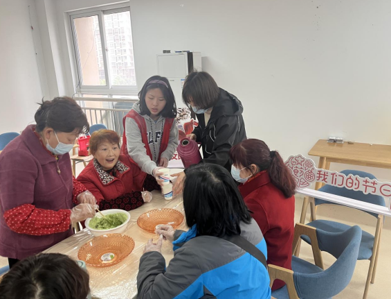 活動(dòng)一開始,志愿者老師從清明由來、清明習(xí)俗、清明美食及清明節(jié)古詩(shī)等方面介紹清明傳統(tǒng)文化,大家對(duì)中華傳統(tǒng)文化有了更深的了解。到了正式制作的階段,阿姨們自告奮勇擼起袖子,捻青、和粉、裹餡,拿到面團(tuán)和餡料之后,在志愿者的指導(dǎo)下,將面團(tuán)切成數(shù)個(gè)小面團(tuán)、搓成長(zhǎng)條,分成大小相近的小劑子,逐個(gè)按扁、壓出空心凹坑,放入適量餡料,用虎口捏攏封口,搓成球,不一會(huì)兒,大小均勻的青團(tuán)就整齊地?cái)[在了蒸籠上,一個(gè)個(gè)模樣俏麗的青團(tuán)就成型了。大家一邊包著青團(tuán),一邊聊著家常,有說有笑,其樂融融,宛如溫馨和諧的一家人。
