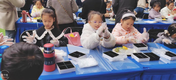 包好后,大家用保鮮膜將青團包起來,放進了盒子里,最后用準備好的貼紙將盒子封起來,青團就算制作完成啦。完成后,大家拿著自己的成果開心的和小伙伴們一起合影留念。