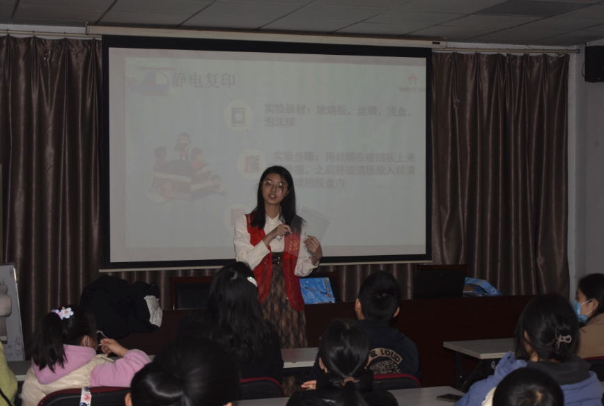 接下來由主講秦渃熹同學(xué)向小朋友們介紹靜電復(fù)印。秦渃熹同學(xué)向小朋友們提出復(fù)印機(jī)的原理是什么這一問題。在一番思索后,小朋友們表示并問題的答案,希望主講同學(xué)能夠?yàn)樗麄兘獯鹨苫蟆S谑乔販c熹同學(xué)取出絲綢,玻璃板,淺盤,泡沫小球等實(shí)驗(yàn)器材,用絲綢在玻璃板上摩擦出“A”字型,蓋在淺盤的泡沫小球上,結(jié)果泡沫小球也呈“A”字型吸附在了玻璃板上。小朋友們瞪大了眼睛,對這一神奇的現(xiàn)象感到不可思議。在志愿者的協(xié)助下,每個(gè)小朋友都獲得了一份實(shí)驗(yàn)器材,能夠自己動手實(shí)驗(yàn)。在確保小朋友們都觀察到了實(shí)驗(yàn)現(xiàn)象后,主講秦渃熹同學(xué)為小朋友們揭開了謎底:正是因?yàn)殪o電能夠吸引輕小物體的特殊性質(zhì),所以絲綢摩擦過的玻璃板能夠吸引泡沫小球。小朋友們恍然大悟,紛紛表示了解到了新知識。最后,朱彥澄同學(xué)總結(jié)了本次活動,并帶領(lǐng)同學(xué)們了解了靜電在電子工業(yè),半導(dǎo)體行業(yè)與醫(yī)療領(lǐng)域如果應(yīng)用不當(dāng)都會產(chǎn)生危害。在生活中,我們可以通過勤洗手洗臉,增加空氣濕度等方法來預(yù)防靜電可能產(chǎn)生的危害。