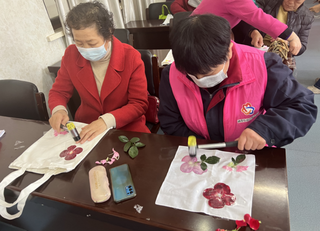 活動(dòng)中,老師詳細(xì)介紹了花瓣拓印工藝的基本知識(shí)、扎染特點(diǎn)及制作技巧。在操作環(huán)節(jié),工作人員為大家準(zhǔn)備了鮮花、棉麻環(huán)保袋、手帕以及小錘子,大家拿著花瓣自由創(chuàng)作。花瓣拓印是充滿文藝色彩的印染方式,只有崇尚自然,領(lǐng)悟生活真諦的人,才能細(xì)心耐心的用拓印的方式,記錄下花瓣細(xì)致的脈絡(luò)。在經(jīng)過(guò)大家或輕或重的敲打保留花瓣隱約的痕跡,在悅耳的碰撞聲中,搖身一變,成為一幅幅驚贊的拓印藝術(shù)作品。