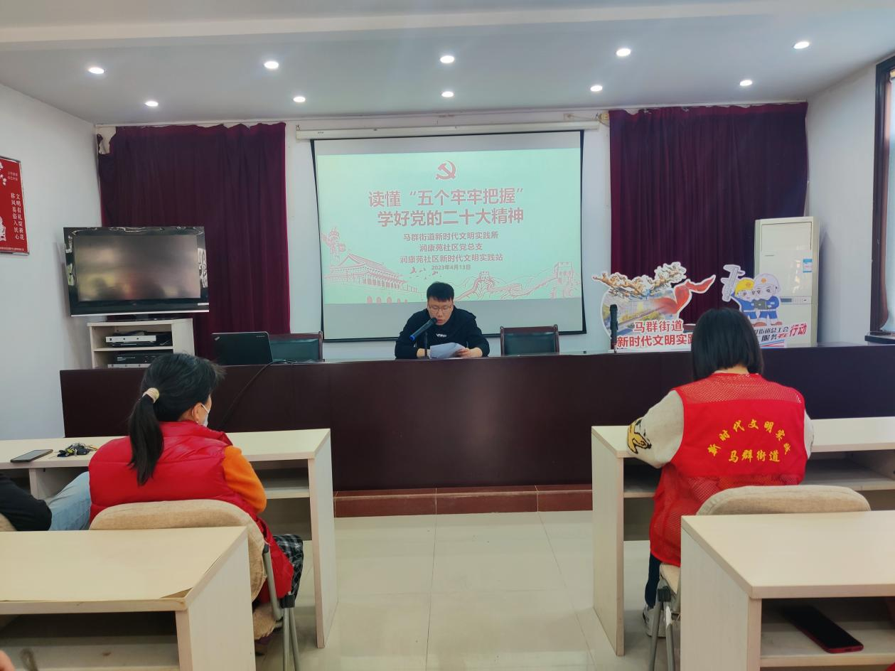 思想之旗引領(lǐng)新的征程,理論之光照亮前進(jìn)道路。為深入貫徹落實(shí)黨的二十大精神,4月13日,南京市棲霞區(qū)馬群街道新時(shí)代文明實(shí)踐所聯(lián)合潤(rùn)康苑社區(qū)黨總支、新時(shí)代文明實(shí)踐站開(kāi)展“讀懂'五個(gè)牢牢把握'學(xué)好黨的二十大精神”理論宣講主題活動(dòng)。