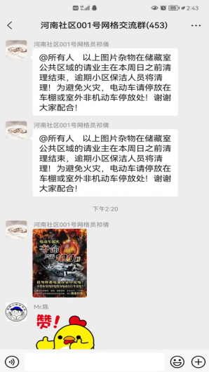 同時,對樓道內(nèi)停放車輛、電瓶車亂停亂放及充電現(xiàn)象進(jìn)行檢查。對占用樓道的車輛,網(wǎng)格員在網(wǎng)格群內(nèi)通知,并將其移到室外電動車停放點。針對私拉電線違規(guī)對電動車充電的情況,發(fā)現(xiàn)問題后及時勸導(dǎo)收回線路,提醒居民把車輛搬到安全地段,并在網(wǎng)格群內(nèi)向居民做好安全隱患問題的宣傳工作。