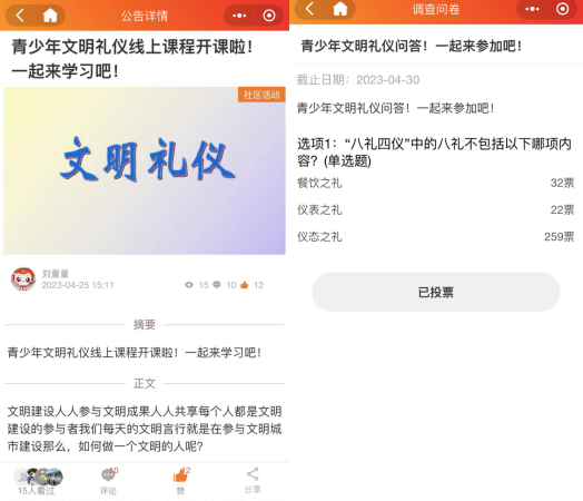 通過(guò)發(fā)布掌上云“八禮四儀”宣傳鏈接、知識(shí)競(jìng)答,社區(qū)工作人員引導(dǎo)家長(zhǎng)分享了孩子們?cè)谌粘I钪凶袷囟Y儀的事例,激發(fā)大家文明禮儀意識(shí),倡導(dǎo)青少年?duì)幾鑫拿鞫Y儀的宣傳者、實(shí)踐者、示范者。大家也紛紛表示將努力當(dāng)好文明禮儀的傳播者和踐行者,為社會(huì)傳播正能量,要為創(chuàng)建文明環(huán)境舔磚加瓦。