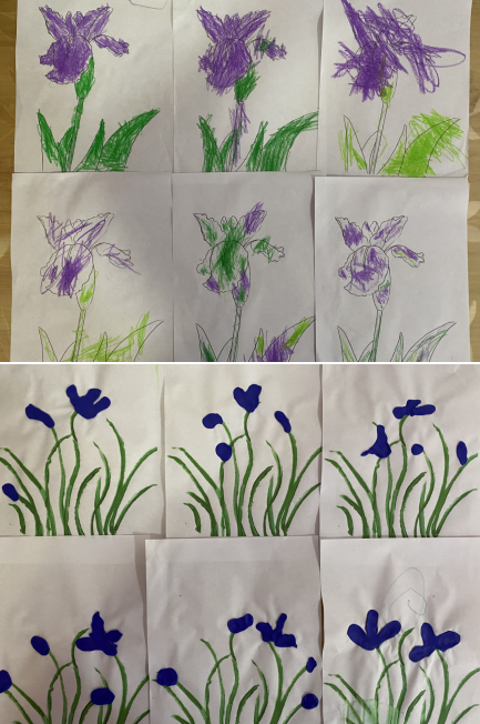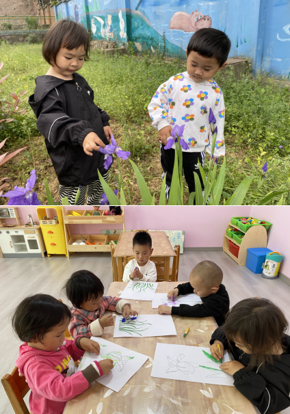 五月,鳶尾花開得正盛,陽光照耀下顯得格外鮮艷,猶如一只只翩翩起舞的蝴蝶。微風拂過,紫色“波浪”輕輕搖曳,美不勝收。孩子們仔細地觀察花瓣的顏色,還有葉子的形狀,并選擇自己喜愛的方式記錄植物,有的為鳶尾花的線描圖添上顏色,有的用超輕黏土在有葉子的圖中添上鳶尾花,在志愿者老師的帶領(lǐng)下,大家一同體會生命成長的可貴。最后,大家開心地展示作品,分享喜悅。