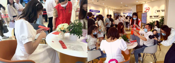 為增添高峰日的浪漫氣氛,在等候處精心布置了許多特色場(chǎng)景,希望新人可以通過(guò)各種特色場(chǎng)景體驗(yàn)到結(jié)婚領(lǐng)證這一高光時(shí)刻所帶來(lái)的莊重和浪漫。大型扭蛋機(jī)器和拍立得大立牌前多位新人駐足良久,以更適合年輕人花樣打卡的方式緩解新人在等待過(guò)程中的焦慮,除了前來(lái)登記結(jié)婚的新人外,也吸引了大量市民前來(lái)打卡。社工為在場(chǎng)的新人提供新婚輔導(dǎo)問(wèn)卷,同時(shí)為他們發(fā)放剪紙工具,制作吉祥的紅色“囍”字,在小小的手工中培養(yǎng)大大的默契。