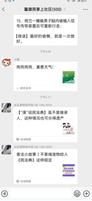 “借條原來還有訴訟時效,要注意及時催討”、“學(xué)習(xí)了,承租人享有以同等條件優(yōu)先購買的權(quán)利”、“遛狗一定要拴繩避免致人受傷”、“學(xué)習(xí)法律知識很有必要,大家一起學(xué)起來”、“感謝錢律師為大家普法,漲知識了”......“掌上云”居民群內(nèi),錢律師與居民間交流互動熱烈,居民學(xué)法氛圍濃厚,并對本次普法科普活動表達(dá)了肯定。