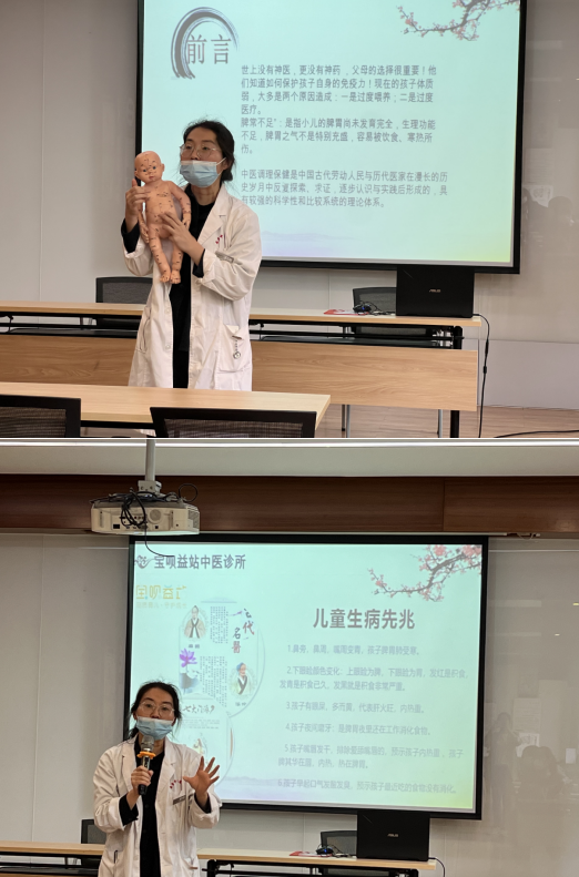 本次活動(dòng),邀請(qǐng)了寶唄益站中醫(yī)診所夏漠老師前來(lái)授課。講座現(xiàn)場(chǎng),夏老師采用理論講解、PPT展示、真人示范等多種方式,用通俗易懂的語(yǔ)言為家長(zhǎng)們講解了小兒推拿、小兒基礎(chǔ)按摩、小兒解決常見(jiàn)問(wèn)題及常規(guī)調(diào)理等知識(shí)和各項(xiàng)步驟。同時(shí),夏老師介紹了小兒推拿的常用守法,包括推、拿、揉、搓、捏等,并在現(xiàn)場(chǎng)給家長(zhǎng)們示范如何正確快速找到穴位的方法。