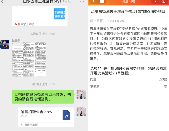 “群主,你好,我是一名下崗寶媽,想在家附近找一份工作,社區(qū)這邊有沒有能夠提供就業(yè)信息。”在掌上云微信群內有居民向社區(qū)求助,群主在接到信息后,第一時間與其取得了聯(lián)系,并就其問題為她聯(lián)系了南京市棲霞區(qū)邁皋橋街道山水園社區(qū)寧姐月嫂工作站,幫助其進行就業(yè)培訓,提供暖心的公益援助。